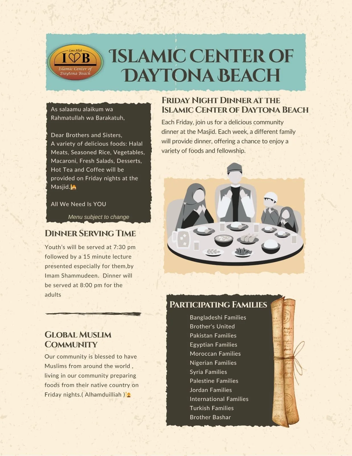 For inquiries and to reserve the event hall, please contact us at the Islamic Center of Daytona Beach. We look forward to helping you create a memorable event.